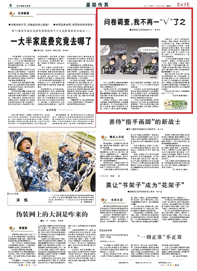 “你認(rèn)為本單位后勤炊事人員軍容形象如何?如不合格,是主觀原因還是客觀原因?”“你認(rèn)為本單位后勤衛(wèi)生制度堅(jiān)持是否規(guī)范?如不規(guī)范,主要是以下誰的責(zé)任?”……問卷在手,一種不一樣的感覺撲面而來。請關(guān)注今日出版的《解放軍報(bào)》——