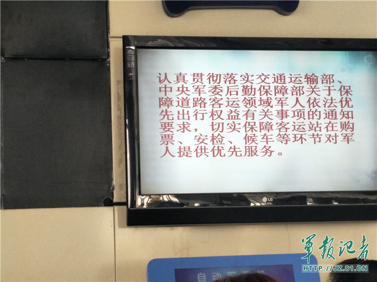 穿過人群,從服務(wù)臺來到候車室,有關(guān)窗口、通道都有制式的軍人依法優(yōu)先標語,檢票口的滾動屏幕不停地播放著軍人依法優(yōu)先的大紅字,在候車室西北角還軍人專門候車區(qū),任站長說,這是專門給軍人提供服務(wù)的。一名軍人家屬告訴記者,有了軍人依法優(yōu)先,購票、安檢一路綠燈,出行更便捷了。