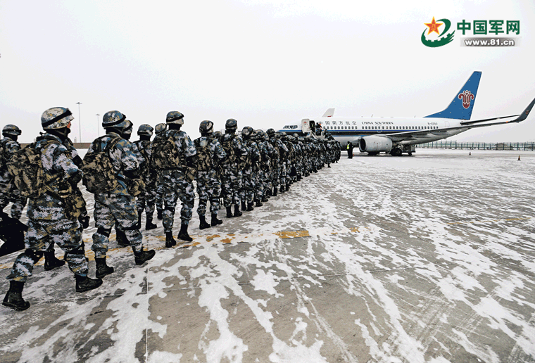 2016年1月,海軍陸戰(zhàn)隊(duì)官兵在西部戈壁大漠完成演訓(xùn)任務(wù)后,從新疆庫爾勒機(jī)場(chǎng)乘坐民航客機(jī)回撤。岱天榮攝
