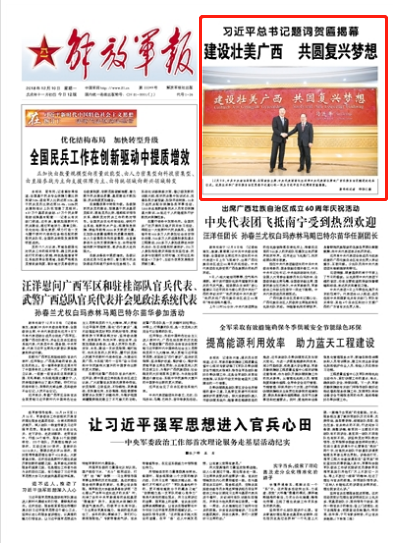 12月9日,中共中央政治局常委、全國(guó)政協(xié)主席、中央代表團(tuán)團(tuán)長(zhǎng)汪洋率中央代表團(tuán)出席向廣西壯族自治區(qū)贈(zèng)送紀(jì)念品儀式。汪洋和廣西壯族自治區(qū)黨委書(shū)記鹿心社一同為習(xí)近平總書(shū)記題詞賀匾揭幕。請(qǐng)關(guān)注今日《解放軍報(bào)》的報(bào)道——