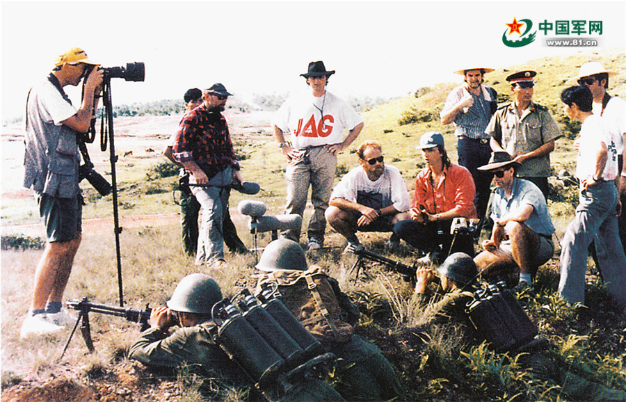 1988年,中外合作電視攝制組拍攝我軍官兵軍事訓(xùn)練活動。