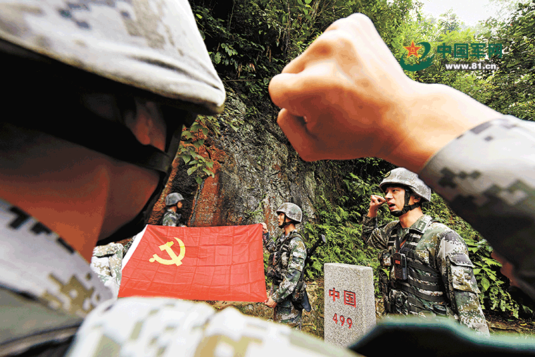 忠誠于黨,衛(wèi)國戍邊。陸軍某邊防連駐守在南國邊陲。多年來,連隊(duì)黨支部著力打造風(fēng)清氣正堅(jiān)強(qiáng)戰(zhàn)斗集體,鑄就了“鐵心跟黨走、鐵拳守邊關(guān)、鐵紀(jì)正作風(fēng)”的連魂。圖為2015年10月,連隊(duì)巡邏官兵在界碑前向黨旗宣誓。解放軍報(bào)記者 李三紅攝