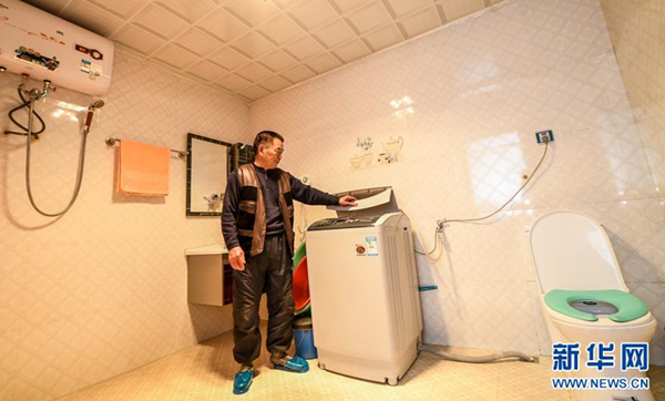 吉林延邊光東村村民全得成在自家衛(wèi)生間內(nèi)使用洗衣機。(新華社記者王昊飛攝)