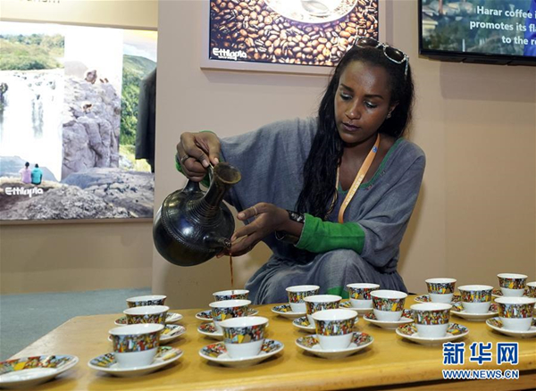2018年11月6日,在首屆中國國際進口博覽會上,埃塞俄比亞參展人員為參觀者倒咖啡。(新華社記者沈伯韓攝)