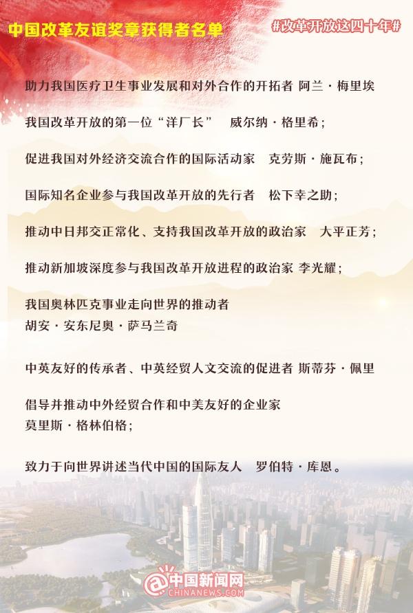 在國內(nèi)的100人之外,為感謝國際社會對中國改革開放事業(yè)的支持和幫助,黨中央、國務(wù)院還決定,向阿蘭·梅里埃等10名國際友人頒授中國改革友誼獎?wù)隆?/p>