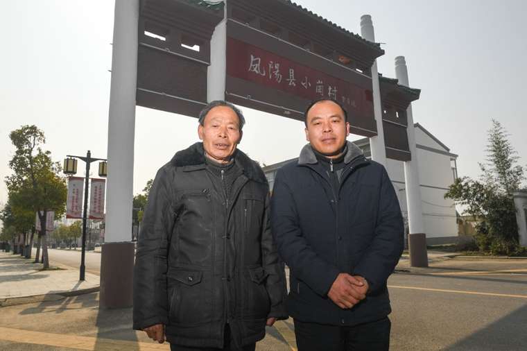 大包干帶頭人嚴宏昌(左)和兒子嚴余山在小崗村合影(2018年3月23日攝)。新華社記者 張端 攝