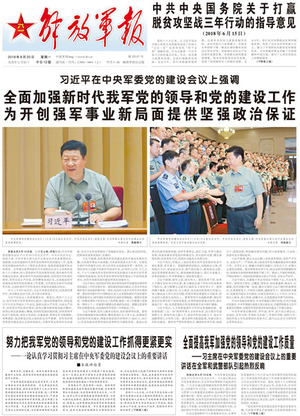 2018年8月17日,習(xí)近平在中央軍委黨的建設(shè)會(huì)議上講話強(qiáng)調(diào),全面加強(qiáng)新時(shí)代我軍黨的領(lǐng)導(dǎo)和黨的建設(shè)工作,為開創(chuàng)強(qiáng)軍事業(yè)新局面提供堅(jiān)強(qiáng)政治保證。