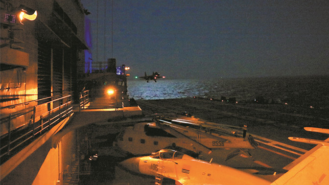 殲-15艦載戰(zhàn)斗機進行夜間阻攔著艦訓練。胡善敏攝