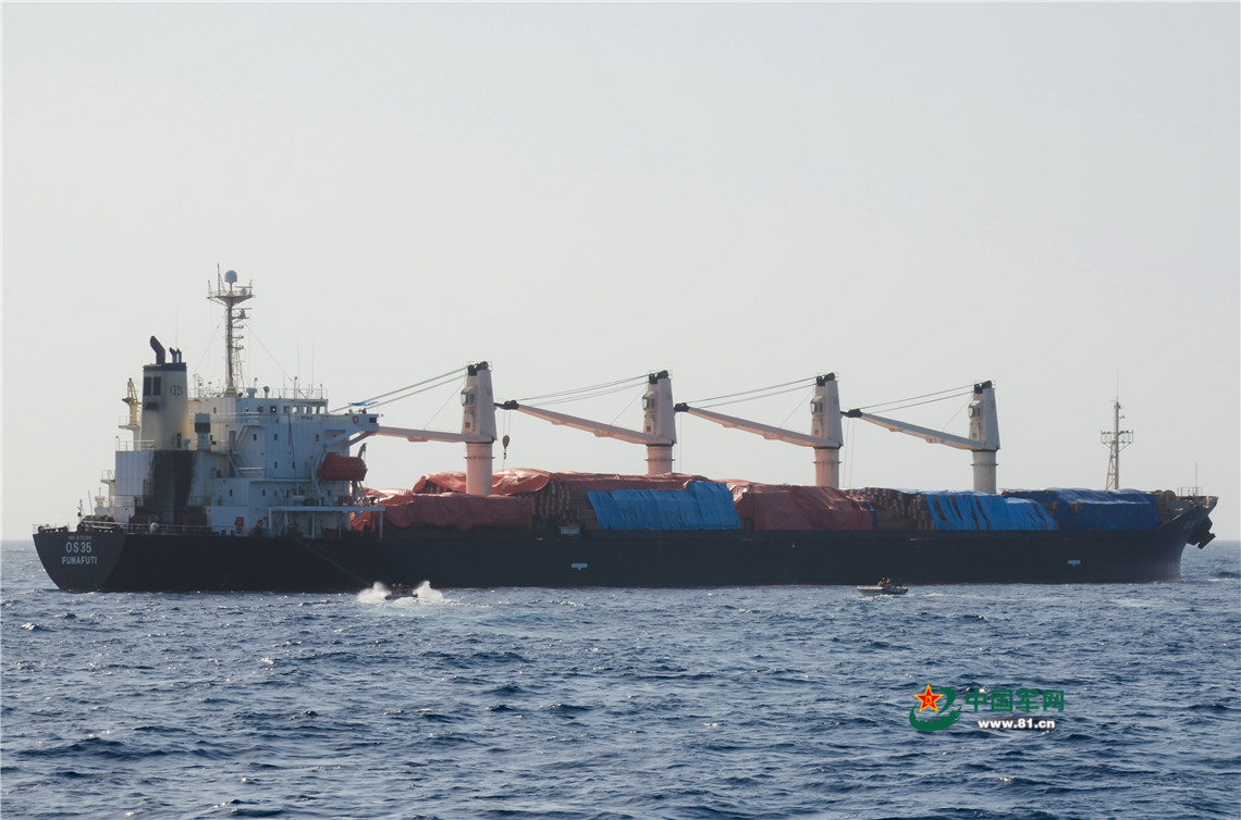 兩艘小艇前往貨船接回隨艦護(hù)航人員。牛云海 攝