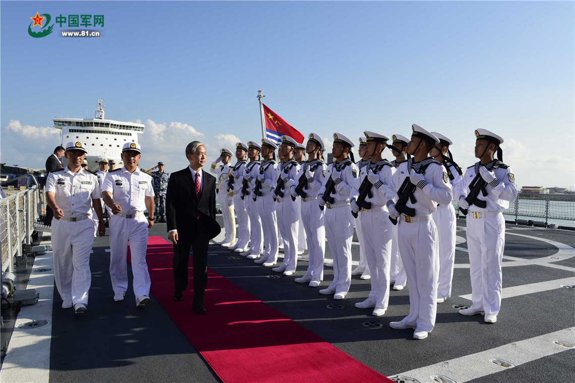 10月14日,蕪湖艦抵達(dá)突尼斯拉古萊特港,我駐突尼斯大使汪文斌在碼頭迎接,并檢閱儀仗隊(duì)。來永雷攝