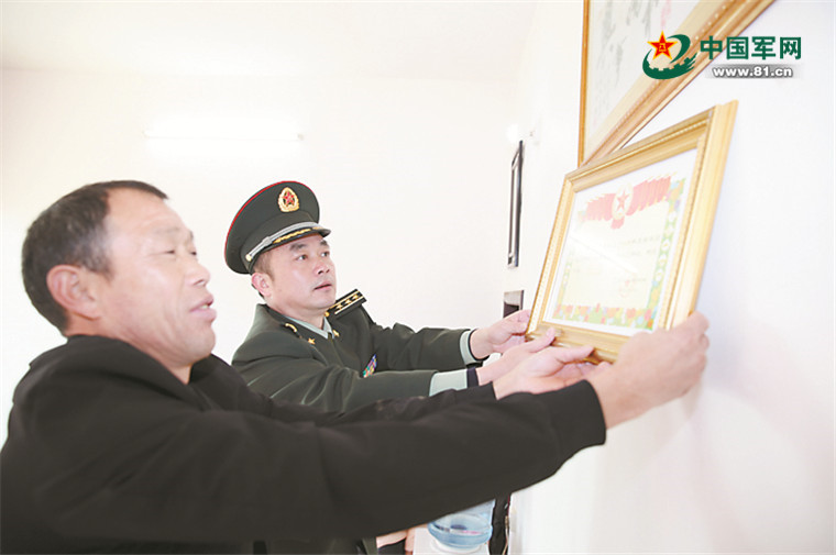 北部戰(zhàn)區(qū)某旅上等兵李明去年榮立二等功。今年1月,郴州軍分區(qū)宜章縣人武部領(lǐng)導(dǎo)將喜報(bào)送到李明的家鄉(xiāng),并將喜報(bào)掛到墻上。 李亮亮攝