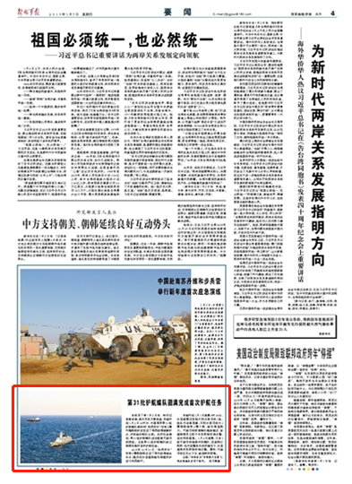 當(dāng)?shù)貢r(shí)間1月2日12時(shí)許,中國海軍第31批護(hù)航編隊(duì)順利將“和煦歡樂”號(hào)等3艘外籍船舶護(hù)送至亞丁灣西部海域解護(hù)點(diǎn),并和被護(hù)船隊(duì)分航。此次任務(wù)期間,第31批護(hù)航編隊(duì)成功驅(qū)離可疑目標(biāo)兩批。這是第31批護(hù)航編隊(duì)獨(dú)立指揮實(shí)施的首次護(hù)航任務(wù)。請(qǐng)關(guān)注今日《解放軍報(bào)》的報(bào)道——