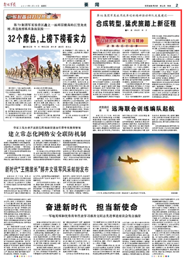 猛虎羽翼豐,轉(zhuǎn)型當(dāng)先鋒。據(jù)了解,自調(diào)整改革以來,第81集團(tuán)軍某旅創(chuàng)新合成營戰(zhàn)術(shù)戰(zhàn)法10余項(xiàng),出色完成了比武競(jìng)賽、實(shí)戰(zhàn)化演練、赴外聯(lián)演聯(lián)訓(xùn)等重大任務(wù),部隊(duì)轉(zhuǎn)型建設(shè)邁上新臺(tái)階。請(qǐng)關(guān)注今天出版的《解放軍報(bào)》的報(bào)道——