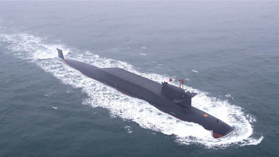 4月23日,慶祝中國人民解放軍海軍成立70周年海上閱兵活動在青島附近??沼蚺e行。這是中國某新型核潛艇接受檢閱。新華社記者 李剛 攝