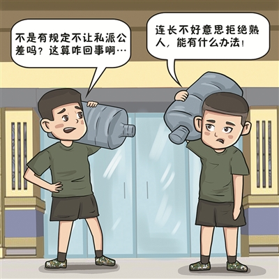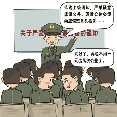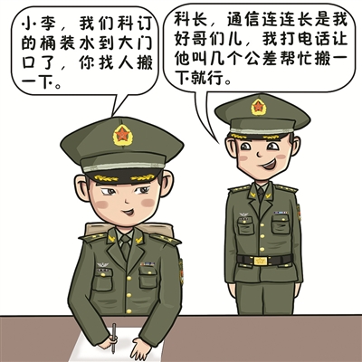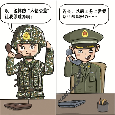 然而,郝小兵在基層走訪了解到,派遣公差的流程規(guī)范了、審批嚴格了,一些不合理的“人情公差”卻又粉墨登場、層出不窮:打著“好兄弟”“老熟人”的旗號,私底下向基層營連主官“借兵辦事”者有之;喊著“都是一家人”,向原單位“伸手動兵”者亦有之;更有甚者,拿著“雙爭評比加分”當令箭,和基層搞交換。