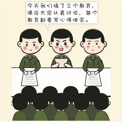 撰寫心得體會(huì),本是為提高教育效果所采取的措施,意在加深官兵對(duì)教育內(nèi)容的理解,但一些單位卻在具體實(shí)施中走了樣。有的機(jī)械要求逢教育必組織討論,逢學(xué)習(xí)必撰寫心得體會(huì);有的則直接以字?jǐn)?shù)篇數(shù)多少來(lái)評(píng)價(jià)學(xué)習(xí)效果好壞……厚厚的心得體會(huì),看似記錄了思考、體現(xiàn)了重視、方便了檢查,其實(shí)很多官兵只是出于應(yīng)付,根本沒(méi)有入腦入心,這樣的教育效果可想而知。