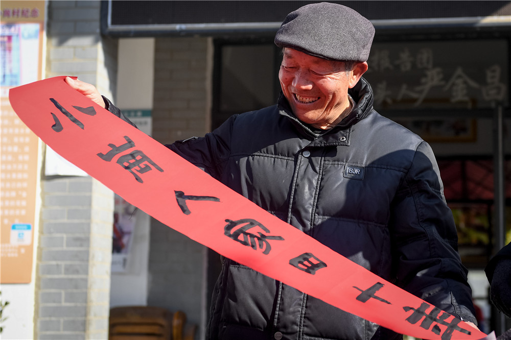 嚴(yán)金昌在家門口展示春聯(lián)。