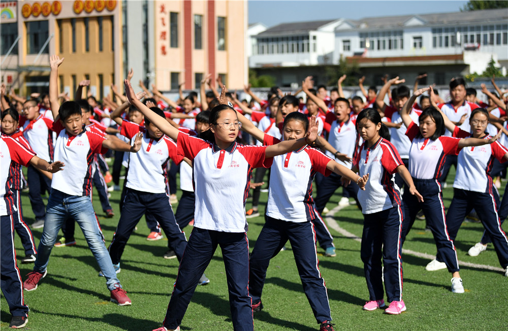 學生在安徽鳳陽小崗村小崗學校內(nèi)開展課間活動。