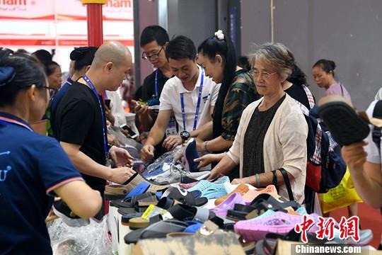 9月23日,在廣西南寧舉辦的第16屆中國-東盟博覽會上,輕便舒適的越南拖鞋銷售火爆。中新社記者 俞靖 攝