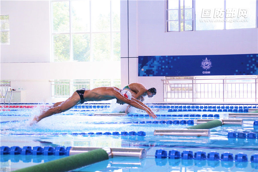9月21日,軍事五項(xiàng)測(cè)試賽障礙游泳中,模擬運(yùn)動(dòng)員穿越障礙。賴泰緯 攝