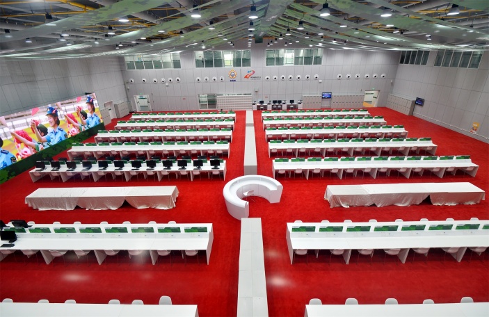 在主媒體中心一樓正中的媒體工作間,350個工位整齊排開,兩層樓的空間高度,加上頂部成排的波浪形軍綠色橫幅,令媒體工作間寬敞宏闊。這里一次可供240位文字記者、96位攝影記者同時工作,物業(yè)、安保24小時工作。媒體工作間服務(wù)臺可租借攝影、攝像設(shè)備;墻邊數(shù)百個小格子里,賽時將第一時間放置打印好的每一場的比賽成績,供記者取閱。