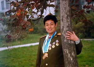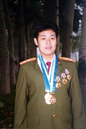 游泳,一堂課一般游3000米,她游5000米;投彈,別人每次投200枚,她投300枚,一次課下來,吃飯拿筷子都困難;女隊員越野訓(xùn)練每天跑十五公里,她跟著男隊員一起跑20公里。隊友們一雙運動鞋能穿一個月,她的鞋不到半個月就磨破了。為了趕超世界強(qiáng)手,她每天的訓(xùn)練長達(dá)十多個小時。爬鐵絲網(wǎng),經(jīng)常把背刮得鮮血淋淋;跳3米斷墻,著地時感覺五臟六腑都像錯了位;過壕溝,胳膊、腿、膝蓋上不知磨掉了多少塊皮肉;越野跑,累得有時趴下就不想起來。本來計劃內(nèi)的訓(xùn)練強(qiáng)度已經(jīng)很大,但徐蕾還不滿足,常常突破訓(xùn)練極限,利用業(yè)余時間給自己上“弦”加“碼”,自找苦吃。一次大賽前,徐蕾左腳嚴(yán)重扭傷,為了不影響訓(xùn)練,她每天偷偷一個人用一只腳從一樓到四樓跳上跳下幾十個來回,由于疲勞過度,結(jié)果一頭從樓梯上滾下來,摔的頭破血流。正是經(jīng)過這種熔爐般的冶煉,過去被父母嬌寵的“白雪公主、掌上明珠”,如今成了身懷絕技的“霸王花”。