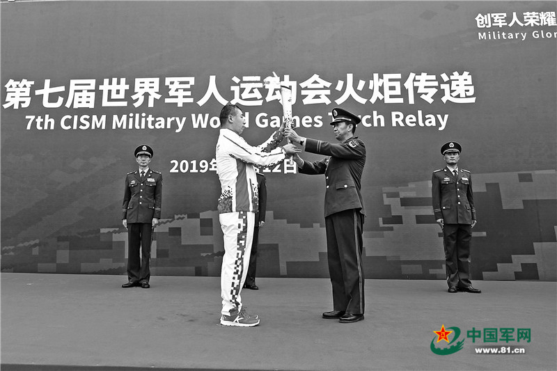 10月12日,第七屆世界軍人運(yùn)動會軍營火炬?zhèn)鬟f活動最后一站武警獵鷹突擊隊(duì)站舉行。本站主題是“運(yùn)動傳遞友誼,衛(wèi)士捍衛(wèi)和平”,共有20名來自武警部隊(duì)的火炬手參與傳遞。圖為傳遞單位領(lǐng)導(dǎo)(前右)將火炬交給第一名火炬手朱忠華(前左)。新華社記者 王 昆攝