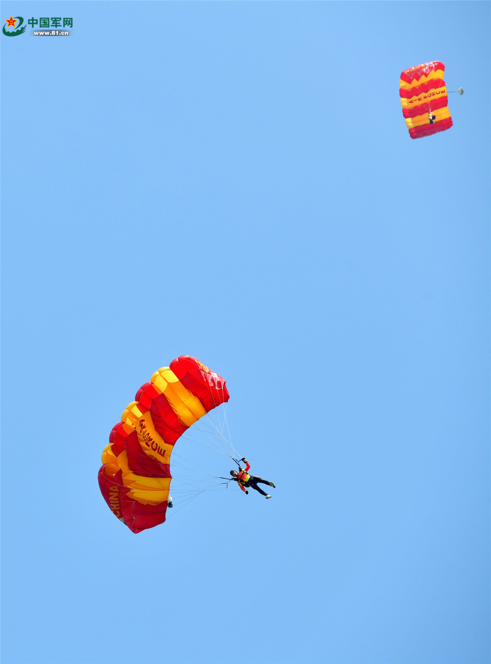 圖為中國(guó)跳傘運(yùn)動(dòng)員在比賽中。新華社記者李賀 攝