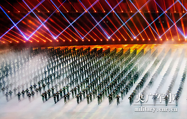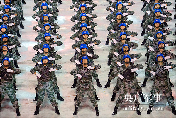 “前進(jìn)!前進(jìn)!前進(jìn)!”,在《和平之師》這個(gè)節(jié)目中,伴隨著鏗鏘有力的音樂(lè)節(jié)奏,中部戰(zhàn)區(qū)陸軍某舟橋旅1792名參演官兵身穿迷彩,頭戴藍(lán)盔,以每橫列56人、縱路32人的陣容,踏著整齊的節(jié)拍,氣勢(shì)如虹地行進(jìn)至舞臺(tái)中央。隨后,方陣依次變換成五角星、UN英文字母隊(duì)形、敬禮的戰(zhàn)士、軍事等高線和長(zhǎng)城等8個(gè)造型。