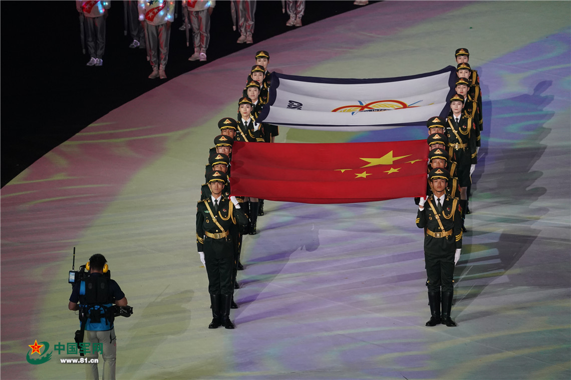 10月18日,第七屆世界軍人運動會開幕式在武漢體育中心舉行。護旗手護衛(wèi)中華人民共和國國旗和國際軍事體育理事會會旗進入開幕式現(xiàn)場。柳軍攝