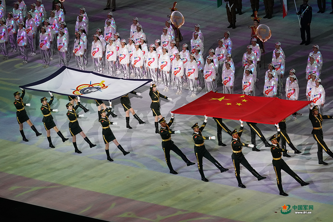 10月18日,第七屆世界軍人運(yùn)動(dòng)會(huì)開(kāi)幕式在武漢體育中心舉行。護(hù)旗手護(hù)衛(wèi)中華人民共和國(guó)國(guó)旗和國(guó)際軍事體育理事會(huì)會(huì)旗進(jìn)入開(kāi)幕式現(xiàn)場(chǎng)。柳軍攝