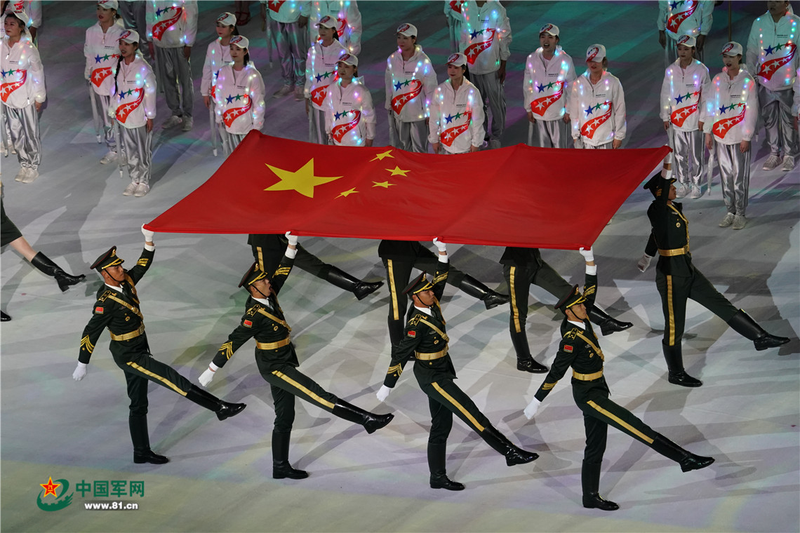 10月18日,第七屆世界軍人運(yùn)動(dòng)會(huì)開(kāi)幕式在武漢體育中心舉行。護(hù)旗手護(hù)衛(wèi)中華人民共和國(guó)國(guó)旗和國(guó)際軍事體育理事會(huì)會(huì)旗進(jìn)入開(kāi)幕式現(xiàn)場(chǎng)。柳軍攝