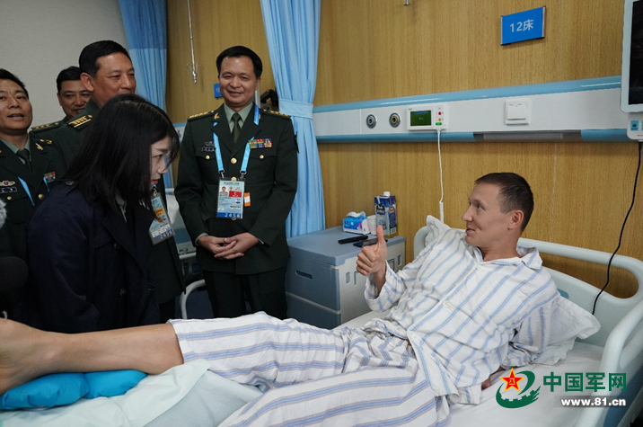 參加本屆世界軍運會的俄羅斯傷員阿列克謝·斯維奇尼科夫點贊軍運會醫(yī)療保障團隊。中國軍網(wǎng)記者馬睿昭 攝