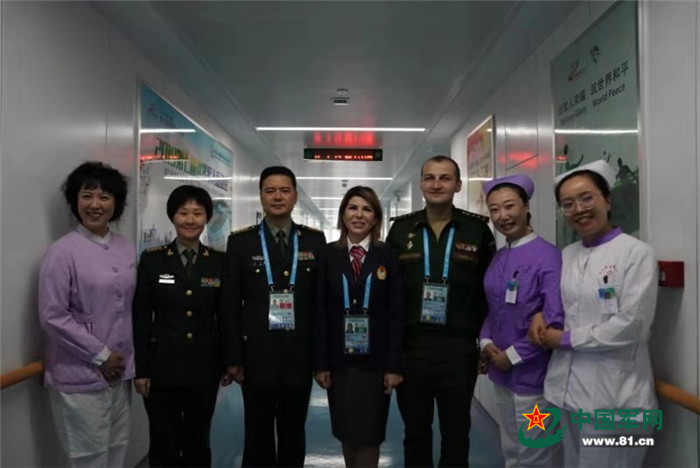 俄羅斯聯(lián)邦代表團總醫(yī)生福拉達·提卡諾娃(中)同中方醫(yī)護人員合影留念。中國軍網(wǎng)記者馬睿昭 攝