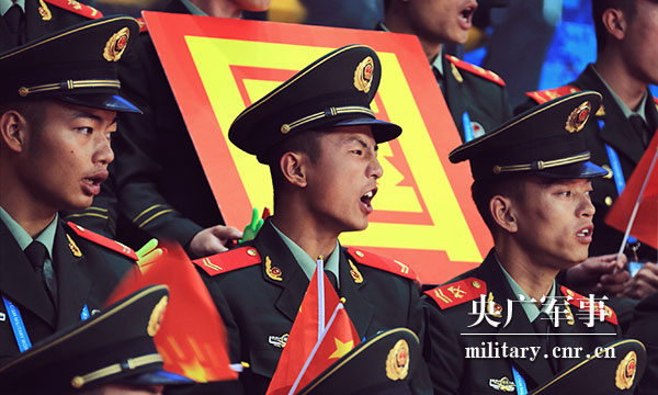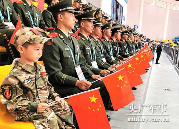 在現(xiàn)場,記者看到了一個最萌“小軍迷”,他身穿迷彩服,手拿小國旗,端正地坐在武警湖北總隊某支隊戰(zhàn)士旁邊,目不轉(zhuǎn)睛地緊盯比賽賽況,給參賽選手加油鼓勁?!靶≤娒浴睍r不時還會偷偷看一眼旁邊的武警戰(zhàn)士,并悄悄調(diào)整自己手里小國旗的高度,爭取把國旗和武警戰(zhàn)士手里的國旗保持同一高度,萌萌的小動作引來現(xiàn)場觀眾的注意。比賽途中,爸爸提出帶他吃飯,他搖搖頭執(zhí)意不肯離開。當看到中國國旗升起的時候,他立刻從座位上站起來向國旗敬禮。