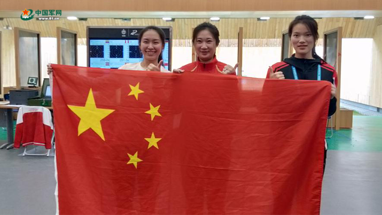 10月21日,冠軍中國隊選手熊亞瑄(左一)、張夢圓(中)、林月美在奪冠后與國旗合影。喬楠楠 攝
