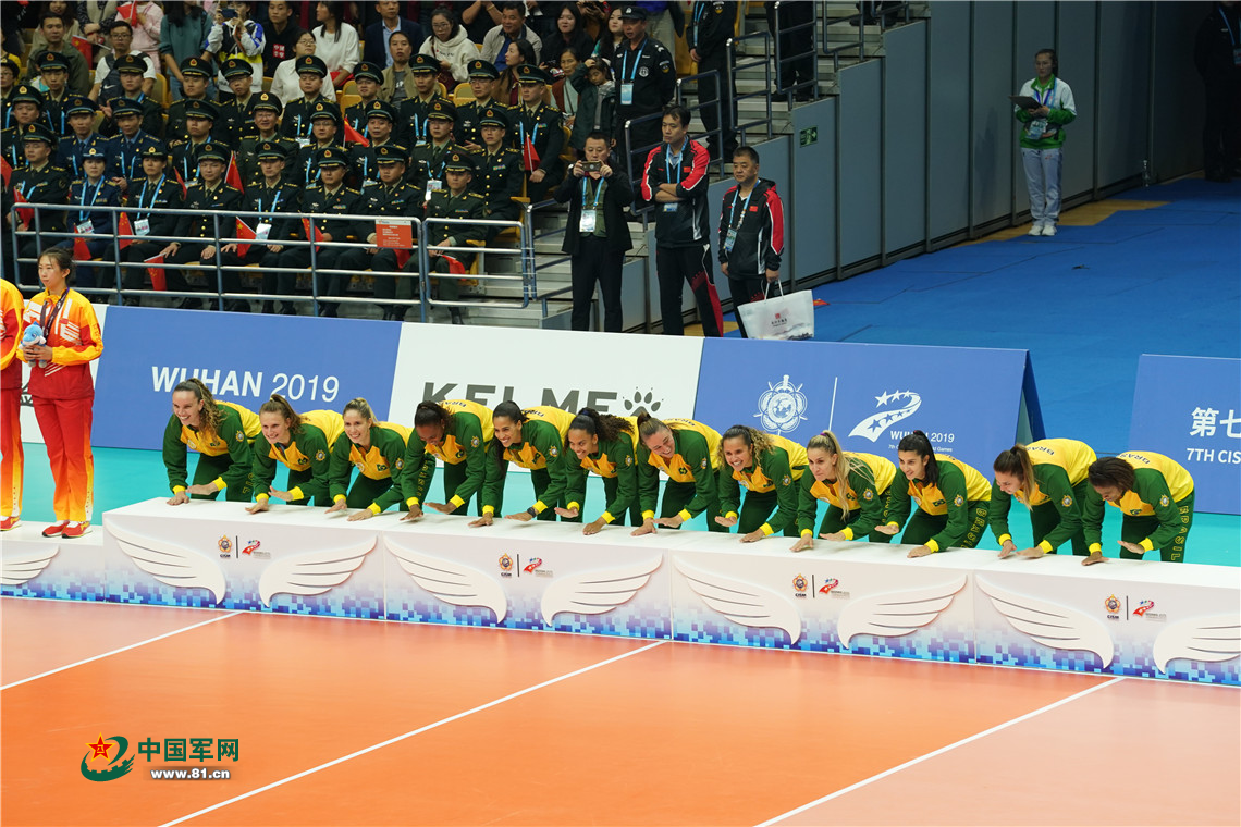 10月22日晚,在武漢進行的第七屆世界軍人運動會女子排球決賽中,中國隊以1比3不敵巴西隊,獲得亞軍。這是巴西隊球員在頒獎儀式上慶祝。中國軍網記者柳軍攝