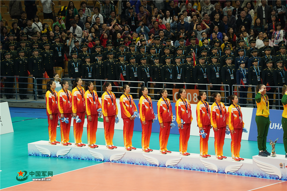 10月22日晚,在武漢進(jìn)行的第七屆世界軍人運(yùn)動(dòng)會(huì)女子排球決賽中,中國(guó)隊(duì)以1比3不敵巴西隊(duì),獲得亞軍。這是頒獎(jiǎng)儀式現(xiàn)場(chǎng)。中國(guó)軍網(wǎng)記者柳軍攝
