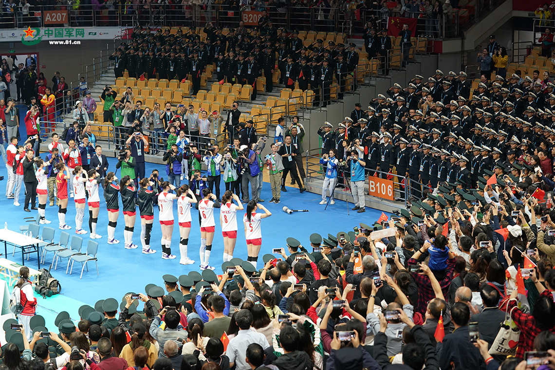 10月22日晚,在武漢進(jìn)行的第七屆世界軍人運(yùn)動會女子排球決賽中,中國隊(duì)以1比3不敵巴西隊(duì),獲得亞軍。比賽后,中國隊(duì)球員與現(xiàn)場觀眾席官兵互致軍禮。中國軍網(wǎng)記者柳軍攝