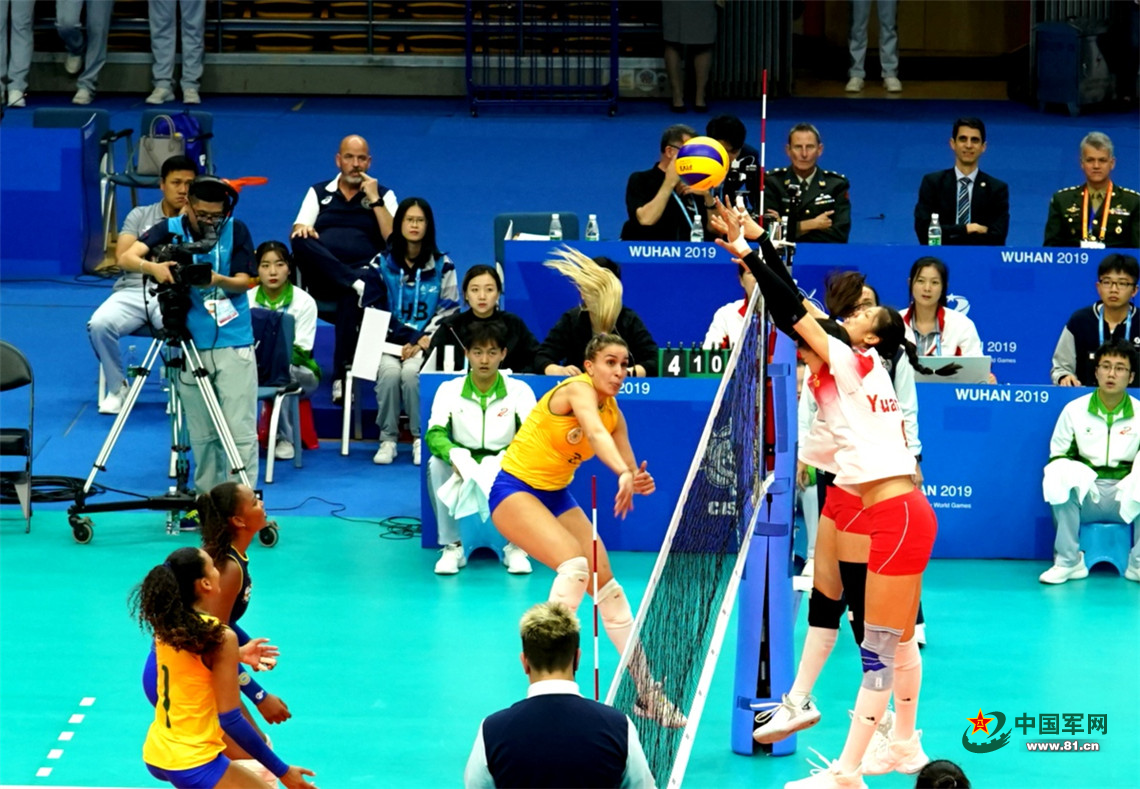 10月22日晚,在武漢進(jìn)行的第七屆世界軍人運(yùn)動(dòng)會(huì)女子排球決賽中,中國(guó)隊(duì)以1比3不敵巴西隊(duì),獲得亞軍。這是中國(guó)隊(duì)球員在比賽中攔網(wǎng)。中國(guó)軍網(wǎng)記者柳軍攝