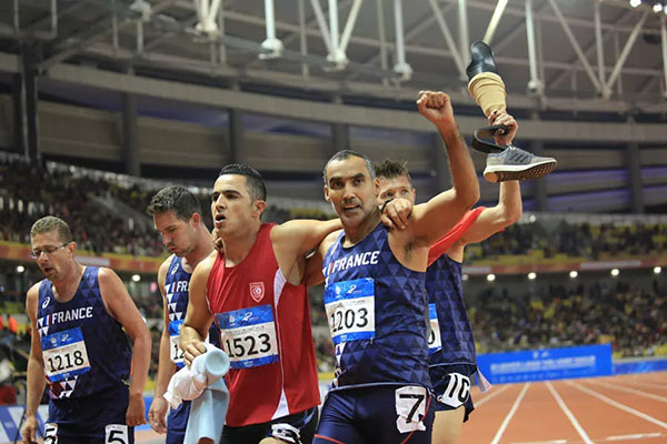 左腿截肢的突尼斯選手吉貝爾在沖過終點(diǎn)時(shí)