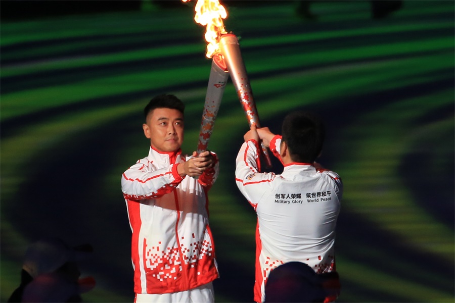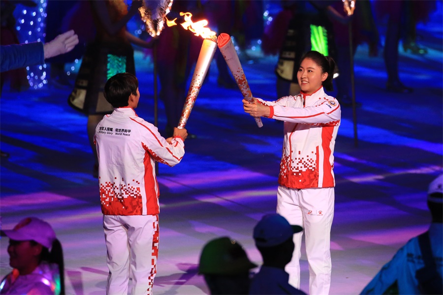 ▲10月18日,第七屆世界軍人運動會開幕式,火炬手在運動場內(nèi)傳遞軍運圣火(攝影:朱西迪)