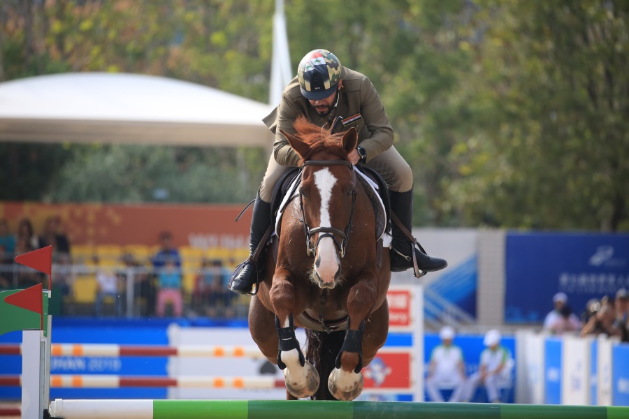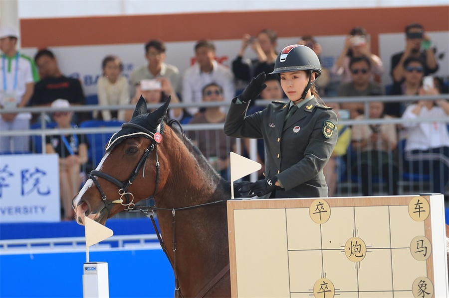 ▲10月21日,武漢商學(xué)院馬術(shù)場,中國女選手田羽(下士)比賽前向評委和觀眾致敬(攝影:朱西迪)