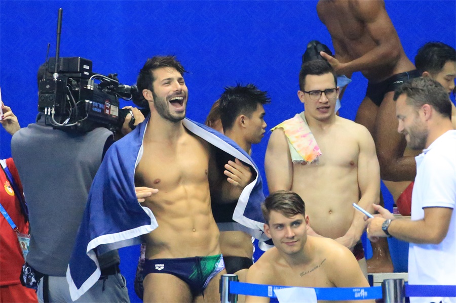 ▲10月24日,武漢體育中心游泳館,男子1米跳板決賽結(jié)束后,外國選手成績優(yōu)秀開心大笑(攝影:朱西迪)