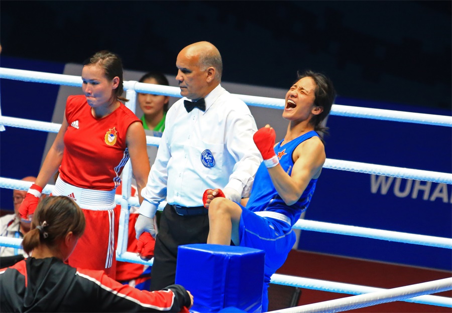 ▲10月25日,武漢體育學(xué)院體育館,軍運會拳擊女子54-57公斤級比賽中,中國選手劉飄飄獲得冠軍后興奮吶喊(攝影:郝錚)
