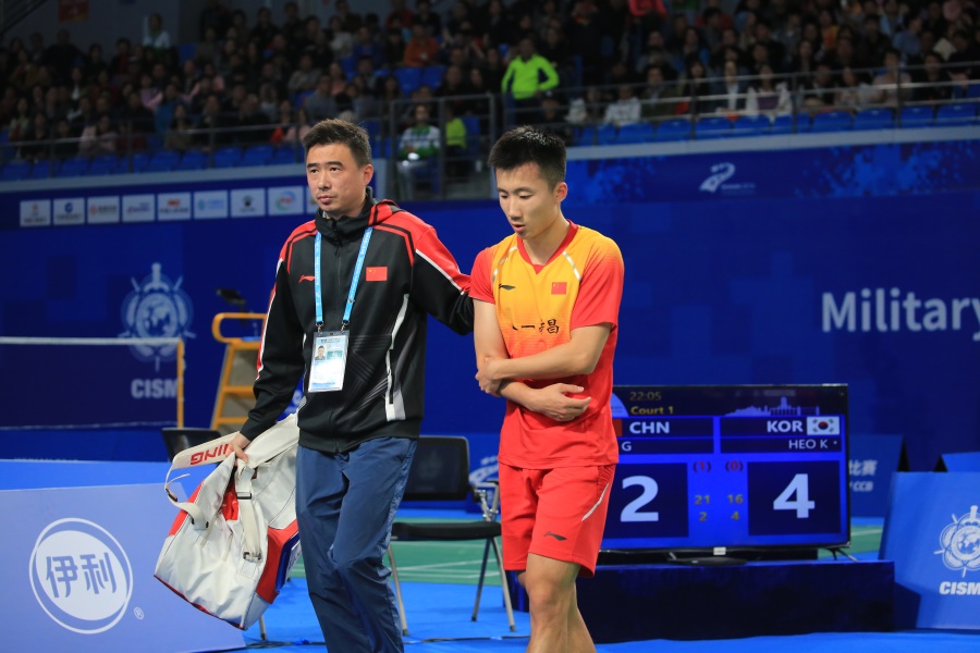 ▲10月26日,武漢大學(xué)大學(xué)生體育活動中心,羽毛球男子單打決賽,中國選手陸光祖舊傷復(fù)發(fā),無奈退賽(攝影:朱西迪)