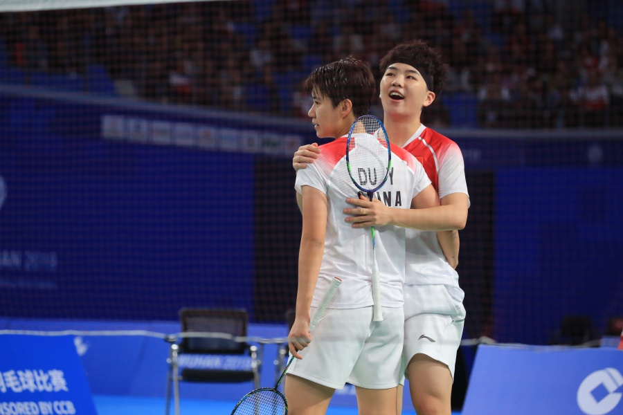 ▲10月26日,武漢大學(xué)大學(xué)生體育活動中心,羽毛球女雙決賽,中國選手杜玥、李茵暉2:1逆轉(zhuǎn)戰(zhàn)勝隊友黃東萍、鄭雨(攝影:朱西迪)