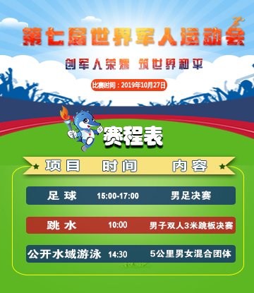 概況:第七屆世界軍人運(yùn)動(dòng)會(huì)將于2019年10月18日至27日在中國(guó)武漢舉行。設(shè)有25個(gè)比賽項(xiàng)目和2個(gè)表演項(xiàng)目。