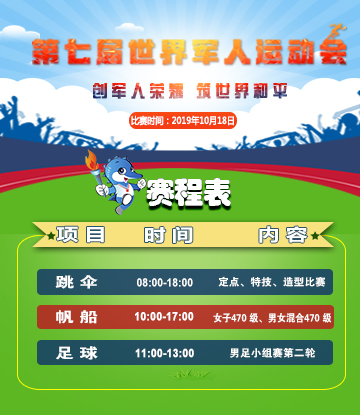 10月18日第七屆世界軍人運動會賽程安排2019-10-14 14:53
