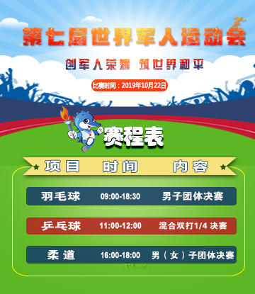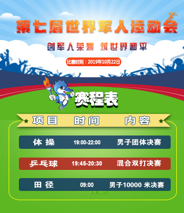 10月22日第七屆世界軍人運動會賽程安排2019-10-18 23:40